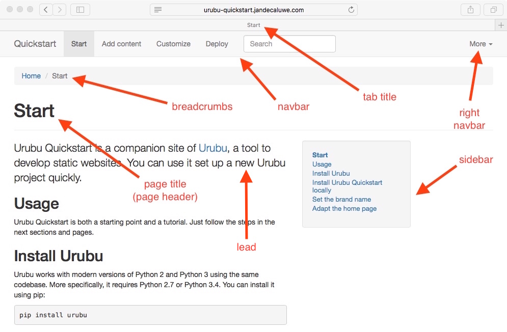 In this section, I use the Start Page of Urubu Quickstart to illustrate the parts of a typical Urubu content page.